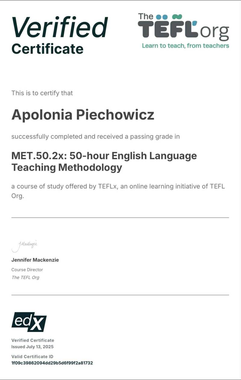 Posiadam dwa certyfikaty językowe Cambridge honorowane na całym świecie FCE i CAE oba z wynikiem na poziomie C1 i poszczególnymi kategoriami na C2 czyli najwyższym stopniu biegłości językowej. Swoją maturę z języka angielskiego napisałam na 100%. Ukończyłam anglojęzyczny kurs metodyki nauczania języka angielskiego stworzony przez TEFL („Teaching English as a Foreign Language”-„ Nauczanie języka angielskiego jako języka obcego”). Brałam udział w konferencji dotyczącej rozwoju komunikacji ustnej na lekcji języka obcego w oparciu o neurolingwistykę. Dodatkowo posiadam uprawnienia wychowawcy grupy maksymalnej piętnastoosobowej.